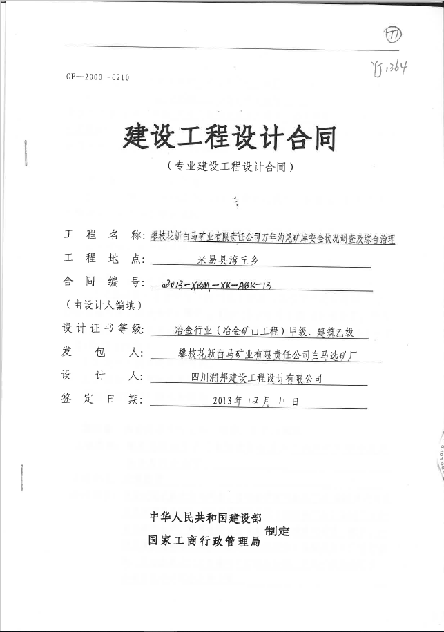 攀枝花新白馬礦業有限責任公司萬年溝尾礦庫安全狀況調查及綜合治理